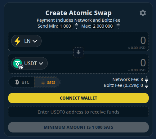 With USDT Swaps, Boltz bridges Bitcoin and traditional finance via USDT directly. Send sats on Lightning, receive USDT. Send USDT, receive sats over Lightning. Move between U.S. Dollar and Bitcoin value on your terms: unruggable, in seconds.